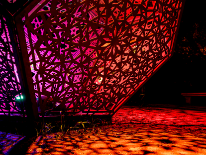 Em Geometric Dreams, a luz e a geometria encontram-se num delicado equilíbrio entre o peso do metal e a leveza dos sonhos. Suspensa sobre a fonte do Parque Marechal Carmona, um espaço também inspirado em motivos da geometria árabe, esta peça irradia tons de esmeralda, safira e rubi, projetando sombras em movimento que desenham um tapete mágico sobre o chão. Inspirada nas lanternas tradicionais do mundo árabe, a obra cria uma ponte entre culturas, tempos e dimensões. Um fragmento de sonho que convida o público a parar, observar e deixar-se levar por esta poesia visual onde a realidade toca o imaginário.